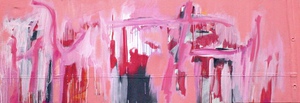 2005met figuratieve elementen, abstract met figuratieve elementen, groot doek geschilderd op stevig polyester zeil, is opgerold, om op te slaan of te vervoeren. Het dient te worden opgespannen, dat werkt met keilbouten in de muur aan de vier hoeken en dan vast trekken of met bijgelverde stokken aan de zijkant om het vast te bevestigen en strak te trekken,